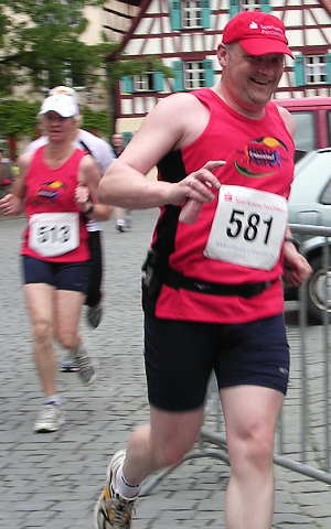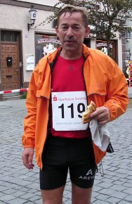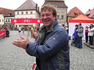 Die ganze Mannschaft von SPORT Dürbeck am Rathausplatz und JD. Jürgen Dehler ein alter Marathon Veteran. Unvergessen sein Einlauf mit Skates, als er