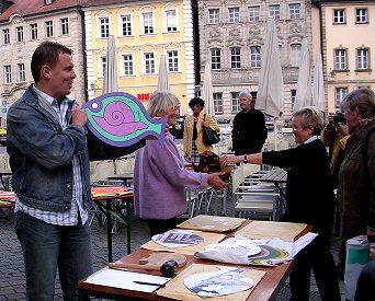Margit Schuler überreicht dem Meistbietenden den “Angela Merkel Fisch”.