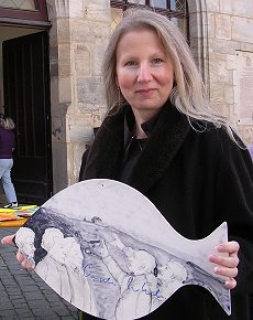 Margit Schuler mit dem von ihr gestalteten Botschafterfisch.